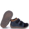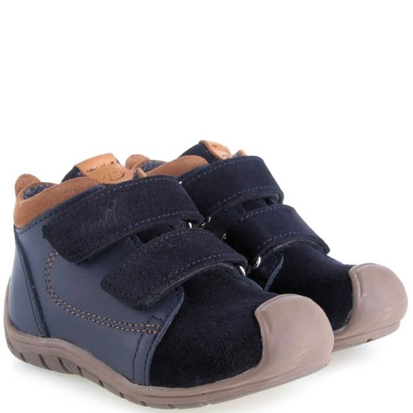 Trzewiki dziecięce w kolorze granatowym firmy Emel zapinane na dwa rzepy wykonane z najwyższej jakości skóry naturalnej. Gumowa antypoślizgowa podeszwa została wyposażona w specjalny bieżnik zwiększający przyczepność. Szerokie noski umożliwiają swobodne poruszanie paluszkami. Podeszwa jest lekka i elastyczna, nie krępuje ruchów, a pełny i sztywny zapiętek zapewnia stabilność. Model ten posiada dodatkowo membranę, dzięki której jest nieprzemakalny. Buty wyposażone zostały w delikatną ocieplinę, dzięki czemu doskonale sprawdzą się w chłodniejsze dni.