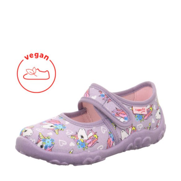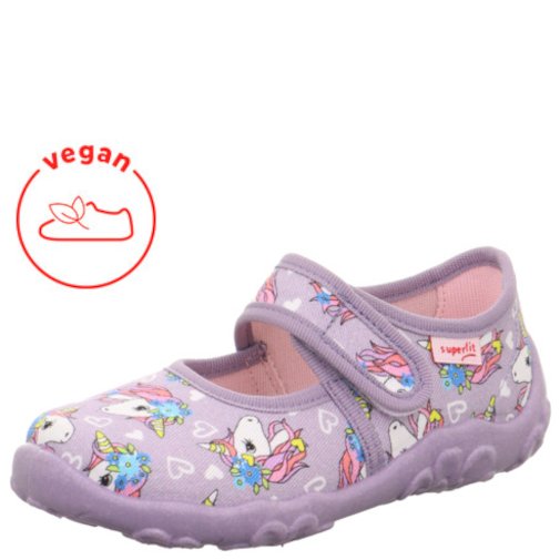 Lekkie i elastyczne liliowe wegańskie kapcie Superfit BONNY w jednorożce wykonane są z najwyższej jakości materiałów. Miękka podeszwa nie ogranicza ruchów stopy. Wzmocniony zapiętek zapewnia zdrowy i prawidłowy rozwój stopy dziecka.