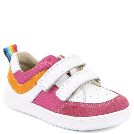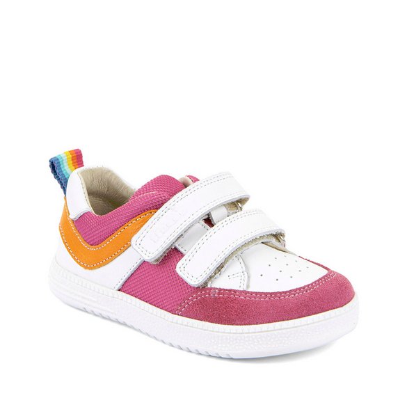 Naturalne miękkie biało-fuksjowe buty sportowe barefoot wiodącej chorwackiej marki FRODO wyprodukowane bez użycia chromu. Podeszwa jest bardzo elastyczna i nie ogranicza ruchów stopy, a zamszowe czubki chronią przed otarciami. Buty są skonstruowane z myślą o anatomii stopy dziecka naśladując pracę bosej stopy. W tych butach stopa dziecka ma zagwarantowaną odpowiednią amortyzację podczas aktywnej zabawy. Podeszwa zero drop i antybakteryjna wkładka.
