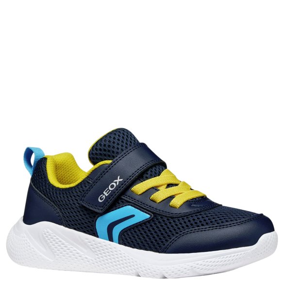 Te bardzo lekkie granatowo-żółte siateczkowe chłopięce buty sportowe Sprintye włoskiego producenta GEOX wyposażone są otwory w gumowej podeszwie, które umożliwiają oddychanie stopom. We wnętrzu podeszwy umieszczona jest membrana wypełniona maleńkimi porami, które pozwalają na wydalanie potu, ale nie przepuszczają wody do wnętrza buta. Pozwala to na stopniowe usuwanie wilgoci z wnętrza buta, dzięki czemu stopy pozostają suche.